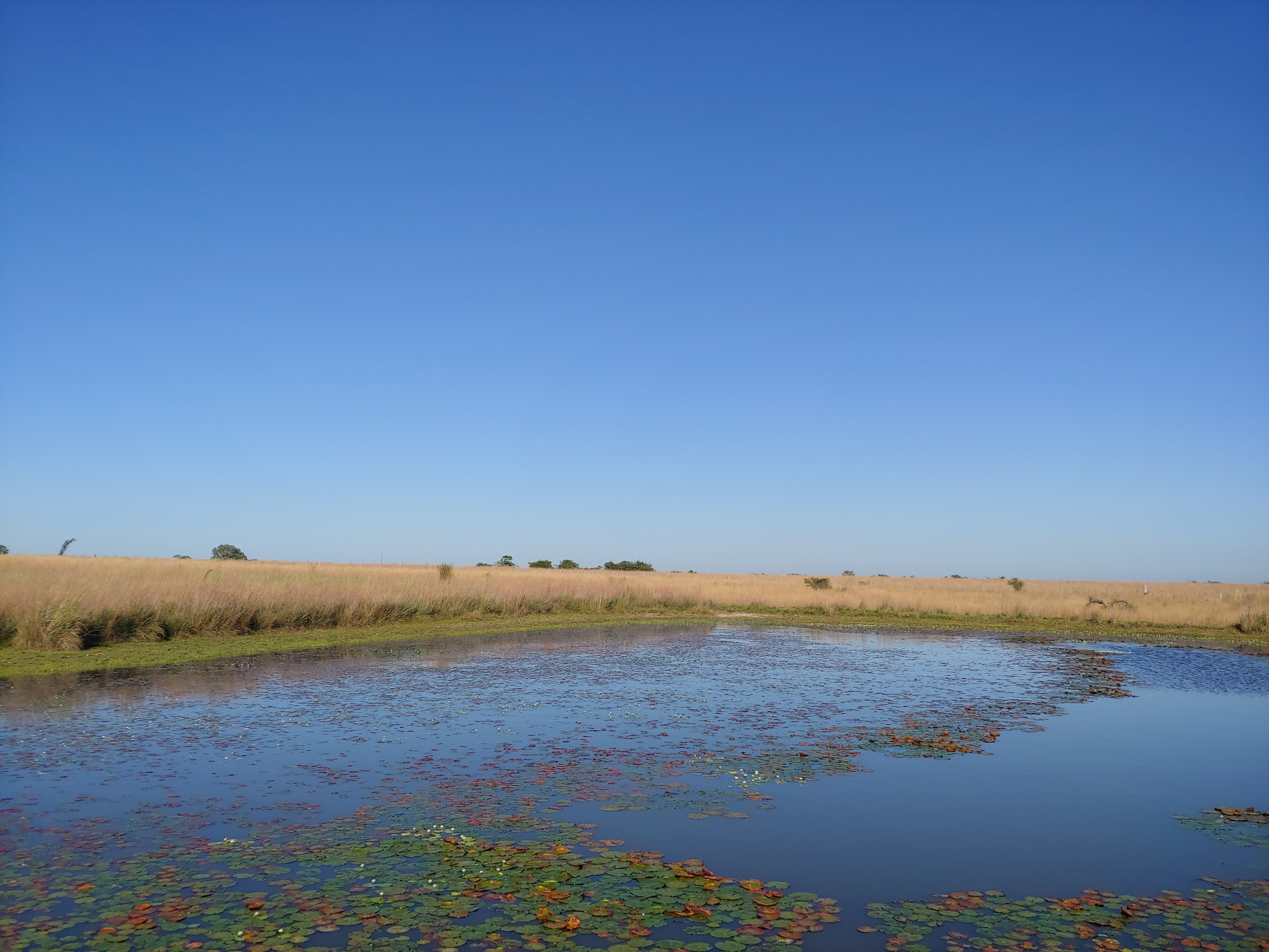 Die Sümpfe werden nur durch Regenwasser gespeist. Unter dem ganzen Gebiet Corrientes liegt eine Lehmschicht, die das Abfließen des Wassers verhindert. Es sammelt sich an der tiefsten Stelle, den Ibera-Sümpfen. Es ist Herbst, es hat seit September nicht geregnet, Regen wird auch nicht vor Juni erwartet. So ist der Wasserstand eher niedrig. Doch es gibt viele Wassergräben, Lagunen und Bereiche mit schwimmenden Inseln.